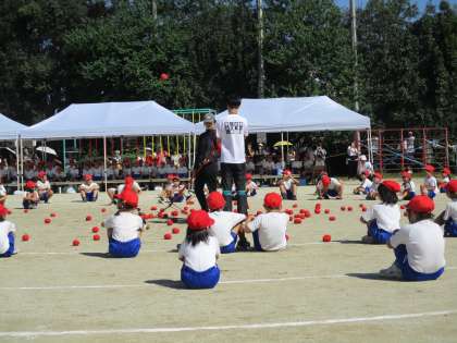 玉入れを終えると、かごに入った玉の数を数えました。子どもたちは、どきどきした面持ちで眺めていました。