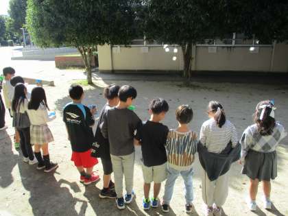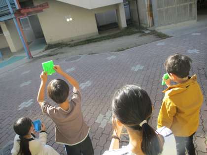 理科「光のせいしつ」の学習で、鏡で日光をはね返して的当てゲームをしました。