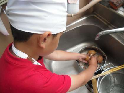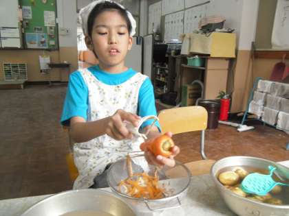 13日(水)畑で調理学習で、カレーとポテトサラダを作りました。畑で収穫したじゃがいもと、なすを使いました。「ええ〜!!カレーになすなんか入れるの?」と反対にあいましたが、「夏野菜カレーなので、入れます!!」と強行しました(笑)なぜかなすびを切るときだけ、手に力が入らない人もいました。