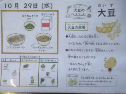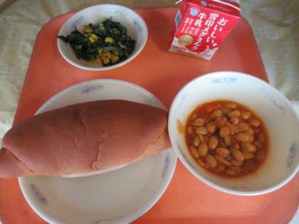 黒糖コッペパン、牛乳、大豆と鶏肉のトマト煮、ほうれん草のソテー