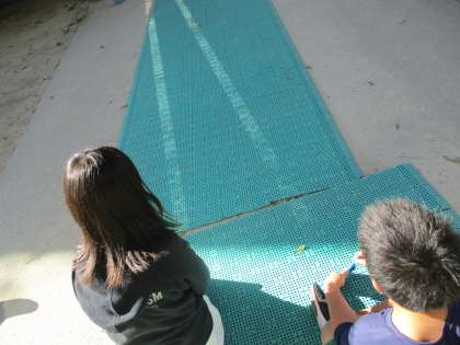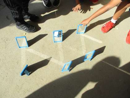 理科「光のせいしつ」の学習で、はね返した日光の進み方について調べました。鏡を複数使っても、はね返した日光はまっすぐに進むことがわかりました。