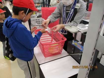 選んだ品物をもってレジに行き、お金の支払いをしました。必要な金額を財布の中から出して支払いました。算数で学んだお金の支払いの学習を活かしながら買い物することができました。