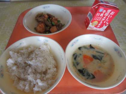 麦ごはん、牛乳、チキンチキンごぼう、豆乳のみそ汁