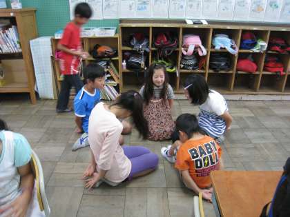 昼休みの時間には昼ごはんの静けさとは打って変わって,各グループで楽しそうに遊んでいました。ハンカチ落としや新聞に乗るゲームやトランプ遊びをしていました。これまでのなかよし遊び以上に1年生が笑顔を見せていました。