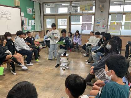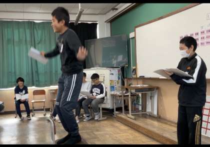 今週は、柿山伏の発表会をしました。柿主と山伏のセリフの特徴を考え、言い回しや間合いなどに気を付けて、演じることができました。1組・2組どちらのクラスも名演技でした。