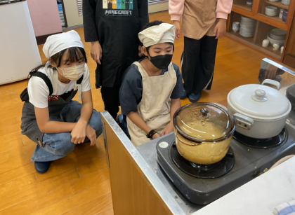 調理実習で、ごはんを鍋で炊き、煮干しで出汁をとってお味噌汁を作りました。