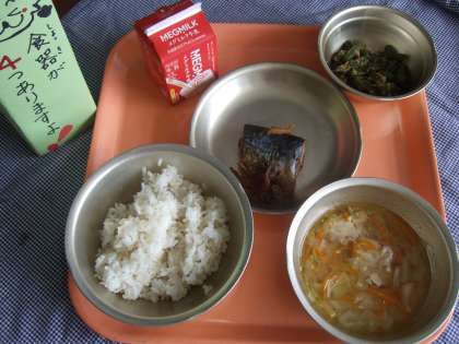 麦ごはん 牛乳 さばの梅煮 三度豆のごま煮 キャベツの吉野汁