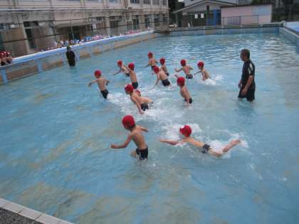 プールの中では,プールの端から端まで歩いたり,友達と水のかけ合いをしたりして水に慣れる学習をしました。