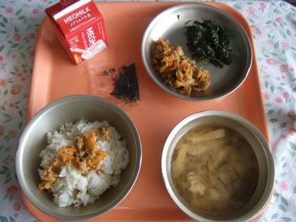 麦ごはん 牛乳 そぼろ丼 ほうれん草のごま煮 もずくのみそ汁 きざみのり