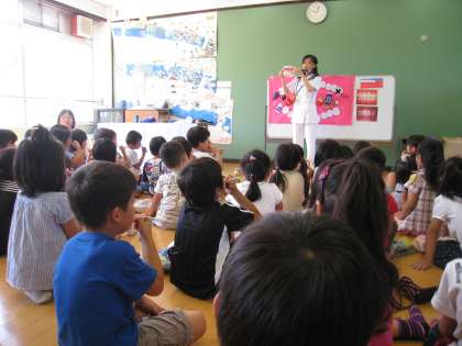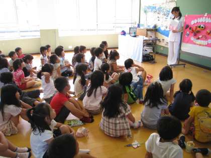 先週の金曜日に歯磨き指導をしました。歯科衛生士の方が来校してくださり,丁寧に歯の正しい磨き方を教えてくださいました。子どもたちは,歯科衛生士の方がもつ歯ブラシの見本を見ながら,優しく自分の歯を磨いていました。