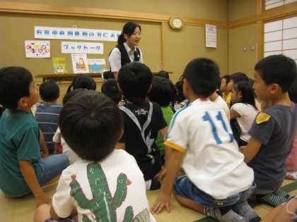 右京図書館の方によるブックトークがありました。本のテーマは,食いしん坊でした。図書館の人の読み聞かせに食い入るように聴いている1年生。