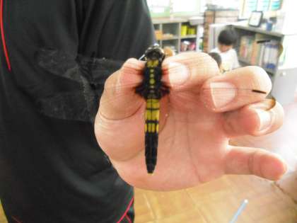 教室にトンボが舞い込んできました。窓や扉を閉め切り、捕獲に成功。さて、あまり見たことがないトンボです。教室にある図鑑にも掲載されていません。さっそくパソコンで調べました。なんと、オオシオカラトンボのメスだということでした。オスはよく知っているけど、雌雄の色があまりに違うのでびっくりしました。