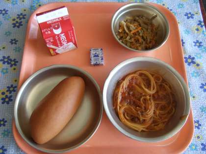 小型コッペパン 牛乳 スパゲティのミートソース煮 ごぼうのソティ チーズ