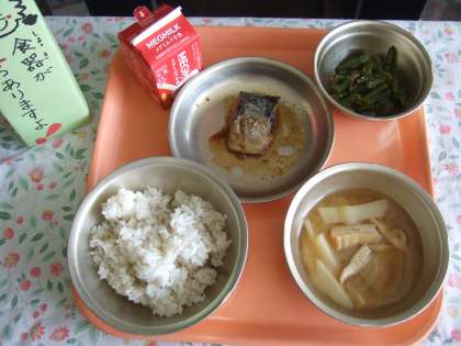 麦ごはん 牛乳 さばのしょうが煮 三度豆のごま煮 みそ汁