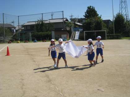1年生の団体競技は,4人で協力して布を使ってパズルを運ぶ競技です。
