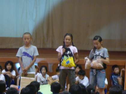 環境交流会があり、各学年で、環境についての取り組みの発表を行いました。