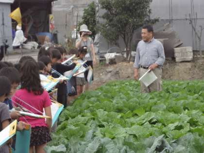 今日3年1組は,社会の学習で畑の見学に行ってきました!70aの広さの畑には,たくさんの野菜が植えられています。いろんな工夫をされて,大切に野菜を育てていらっしゃることを聞きました。
