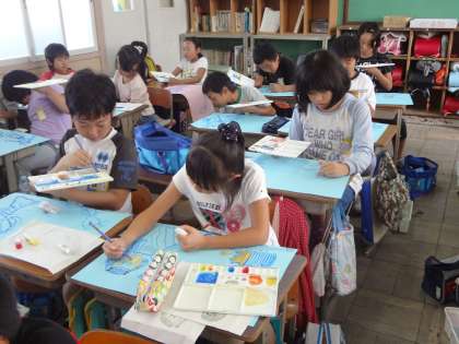 今,どの学年も図工の学習でお話の絵に取り組んでいます。お話を聞いて,自分の思い描いた場面を自由に絵にしていきます。みんな,絵を描くときは楽しそうです!