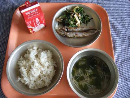 麦ごはん 牛乳 ししゃものからあげ 青菜の中華風いためもの わかめスープ