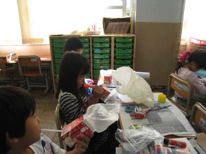 ビニール袋とストローを使って,とびだす仕組みを作りました。作ったあと,みんなで一斉にフーっと吹き,「すごーい」と子どもたちからは歓声が起こりました。