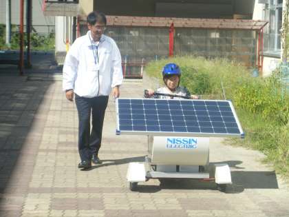 去る9月26日(水)に日新電機の方のご協力のもと,一人一人がソーラーカーに乗り体験することができました。子ども達は笑顔いっぱいで,楽しく体験することができました。