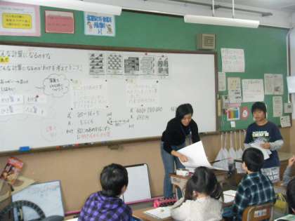 算数科の学習の様子です。『どんな計算になるのかな』という単元で,なぜその式になるのか,どう考えたのかを順をおって分かりやすい言葉で説明しています。上手に説明できる児童が増えてきました。