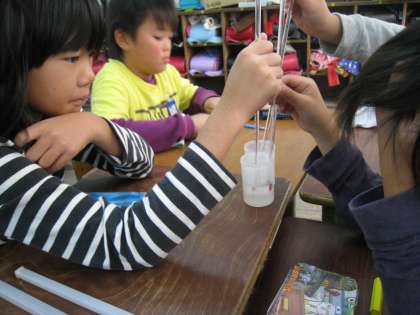 目盛りは真横から読むことを学習し,今日はお湯と水の温度を測ってみました。