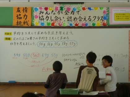 “54g、56g、55g、58g、57gの5つのたまごがあります。たまごの重さの平均を工夫して求めましょう。”という問いに対して、いろいろな考え方が出てきました!!集団解決に向けて、お互い、自分の考えを一生懸命書いています。