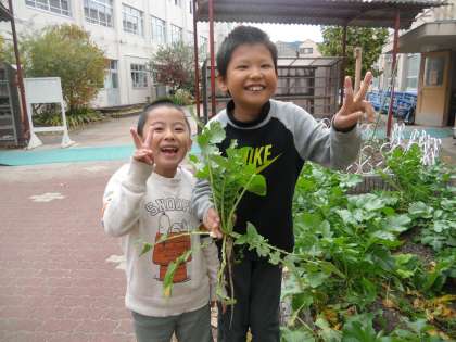 15日(木)の給食で大根葉とシャケフレークのまぜごはんがおいしい、ということで大根葉を使った炒め煮を食べようということになりました。ITさん、TWさんが畑に混み合ってきた大根を抜きました。その後、ITさんが大根についている土や小さな虫をきれいに洗い流していました。