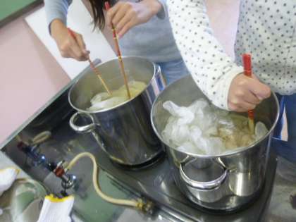 最初の時間は、布を液につけて、混ぜて、水洗いして干すというところまで行いました。