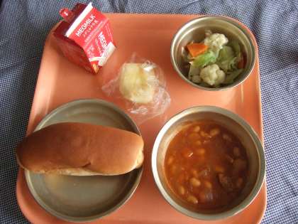 牛乳 ミルクコッペパン ポークビーンズ カリフラワーのホットマリネ りんご