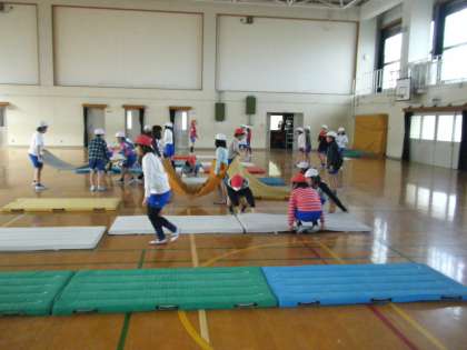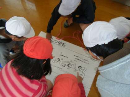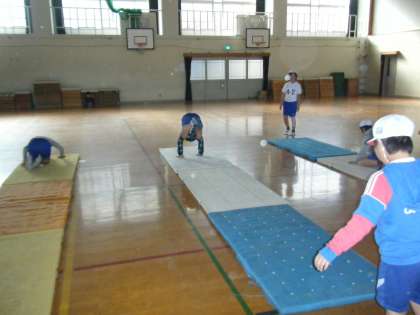 体育科の学習でマット運動をしました。場作りから体ならしまで自分たちで行っています。そして,4年生までにどんな技を習得したか技探しをしています。