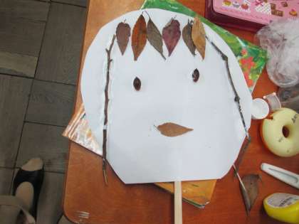 はっぱで目や鼻を作ったお面やどんぐりごまを作っている子や