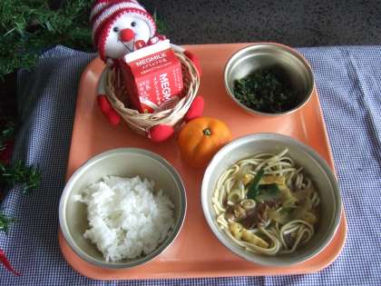 今日のメニューは、子どもたちに人気のカレーうどんです。 煮びたしは、ほうれん草とえのきを使用しました。 子どもたちは、たくさん食べてくれたので、全校でごはんとおかずをあわせて、600gの残菜でした。
