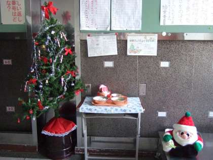給食室のホールが楽しい雰囲気になるように、クリスマスツリーを飾りました。