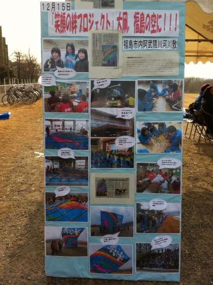 昨日は少年補導主催の「凧作り教室」が行われましたが,今日は,その凧や地域各種団体の大凧をあげる日で,準備をしている風景です。梅津北小学校の児童会が作った凧(福島にもって行った凧のミニ版)もあげます。福島に行ったときの様子もパネルにして掲示されました。そのパネルは,自由参観や図工展でもご覧いただけます。