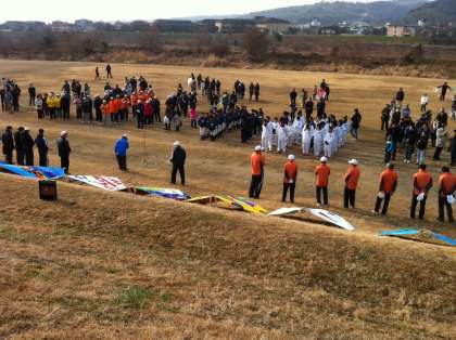 午前9時30分,開会式の様子です。全部の凧が大空にあがりますように。