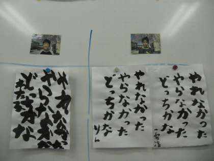 「やらなかった やれなかった どっちかな」という3行の言葉をお手本を見て書きました。