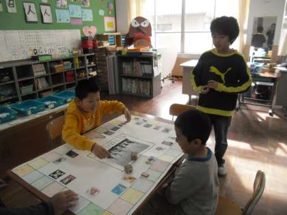 算数すごろくをしました。コマがとまったところのマス目の色で問題が決まります。5,6年生は問題カードにかけざんを追加しました。