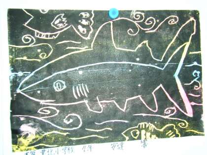 彫り終えるとインクを付けて刷り,乾かしてから裏から絵の具で色を付けていきました。