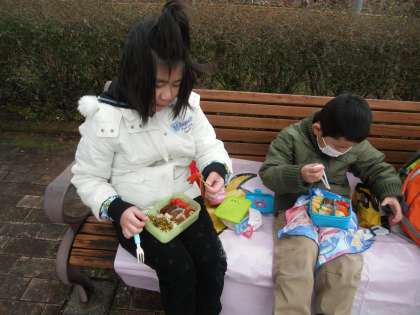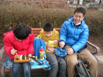 5年生と一緒に車のリサイクル工場や車の工場に行きました。強い風が吹きさらしの寒い寒い屋外での昼食の様子です。工場見学の様子はまた、後日に・・・