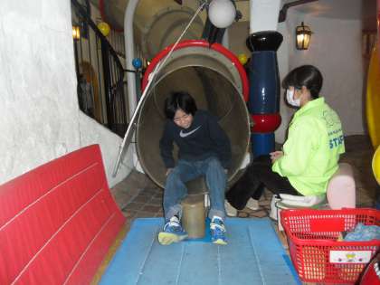 JRの車内の様子、キッズプラザ内の大型すべり台の様子です。