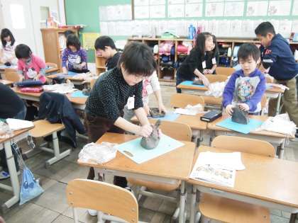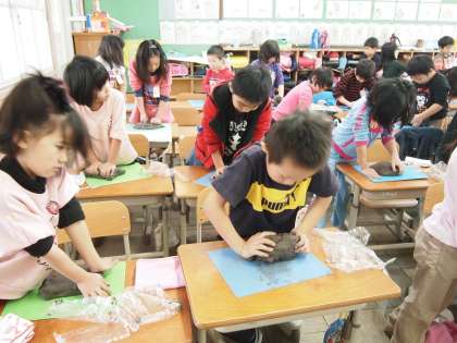 土粘土は始めは固いので,子どもたちは立ち上がって力いっぱいに練っていました。