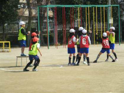 4年生での体育,最後の単元『ポートボール』が終わりました。空いたスペースへ走りこみ,パスをもらいゴールマンにパスをして得点を決めていきます。チームで作戦を決めて色々な攻撃が見られました。みんな上手になりました。