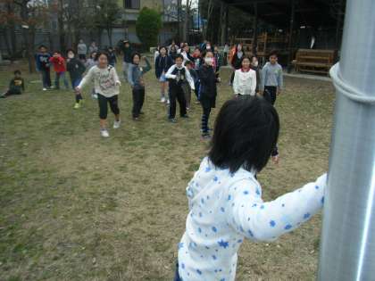 みんな遊びをしました。運動場は他学年が体育の学習で使っていたので,緑の広場でした遊びは・・・。なんと・・・昔なつかしの『だるまさんがころんだ』です。遊び方を知っている児童も何人かいて,おおいに盛り上がりました。