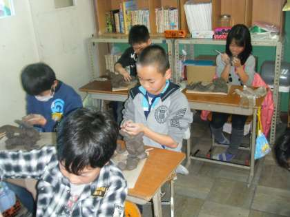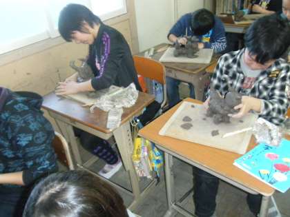 図工の時間に土粘土で『シーサー』を作りました。迫力ある表情や,鋭いつめをよく観察して粘土をつなぎ合わせていきました。立派なシーサーが出来上がりました。