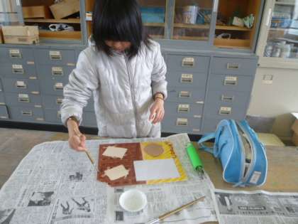 絵の具でカラフルに仕上げた後、今度は、ニスで光沢を出します。