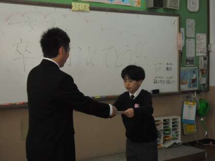 とうとう、IRさんとのお別れです。教室に1,5年生のみんなと保護者の皆様、それに、去年の卒業生と保護者の方も集まって、最後の学活をしました。