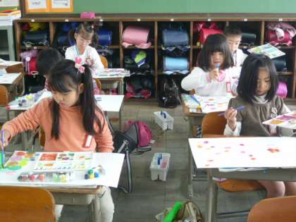 そこで、図工の時間に、三原色をもとに、いろいろな色を作ってみました。
