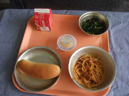 小型コッペパン 牛乳 スパゲティのミートソース煮 ほうれん草のソティ りんごゼリー